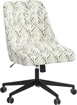 The soft curvature of our Janeran II office chair envelopes the back for incredible comfort. The sleek upholstery and stream-lined shape make it a versatile addition to any office space. Manufactured in the USA, it is both sturdy and cushy, with hand upholstery in a brushed palm leaf patterned fabric. This office chair has a 360-degree swivel mechanism that adjusts for height and features metal casters for ease of movement. Customer assembly is required. This piece is made to order and may take up to 6 weeks to deliver.