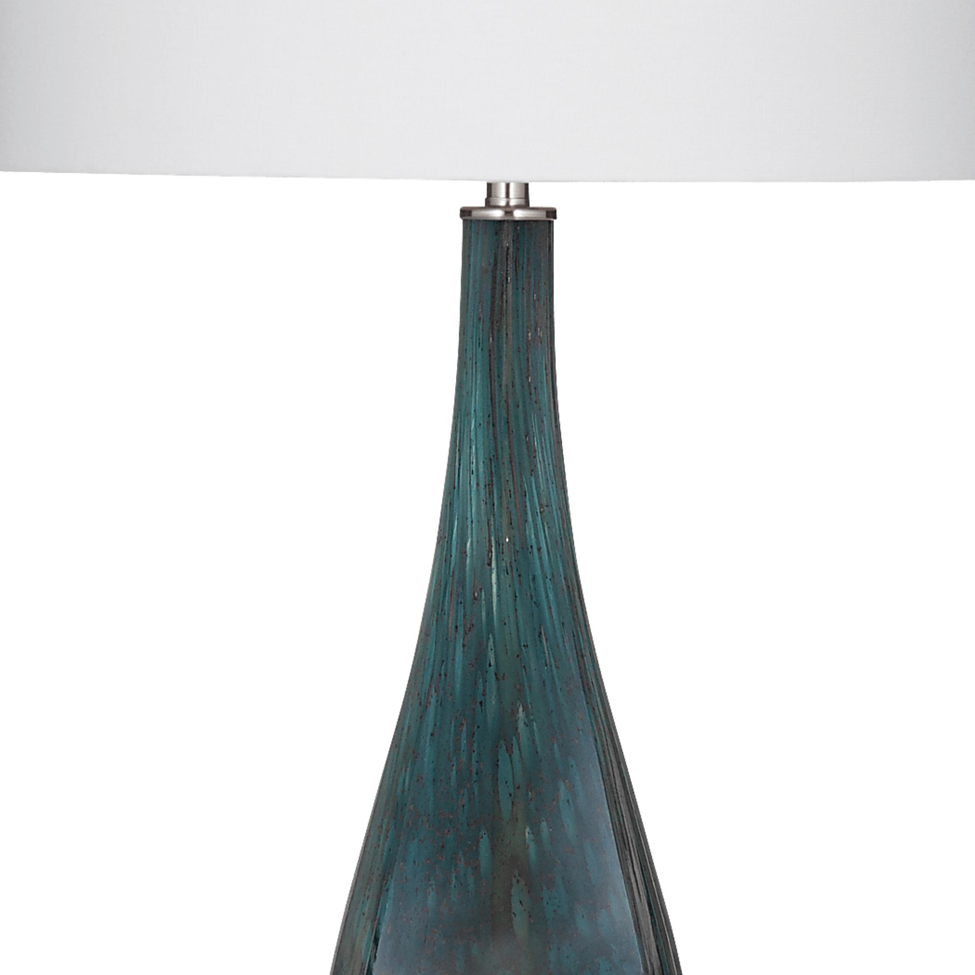 Update your home decor with the Jardin Creek lamp for an elegant look. This lamp is crafted of art glass, in a beautiful blue finish, topped with a crisp white drum shade. This lamp is perfect for a bedroom or living room setting. The hand-crafted details produced by a skilled artist lends itself to a unique technique and will vary slightly. Partial assembly may be required.