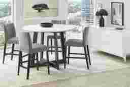 Round out your mealtime look with the Jarvis dining room. Contemporary in style, this collection features a 50-inch round tabletop crafted with hardwood solids in a white marble design. An espresso finish on the interconnected pedestal base complements the ornate details of the tabletop for the perfect final touch.