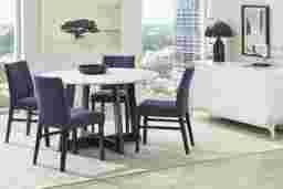 Round out your mealtime look with the Jarvis dining room. Contemporary in style, this collection features a 50-inch round tabletop crafted with hardwood solids in a white marble design. An espresso finish on the interconnected pedestal base complements the ornate details of the tabletop. Four upholstered side chairs feature vertical channeling that runs down the center of the gently sloping backs and spacious seats that emphasize the fabric's gorgeous blue color. Matching espresso finish on the chair legs offer the perfect final touch. 100% Polyester