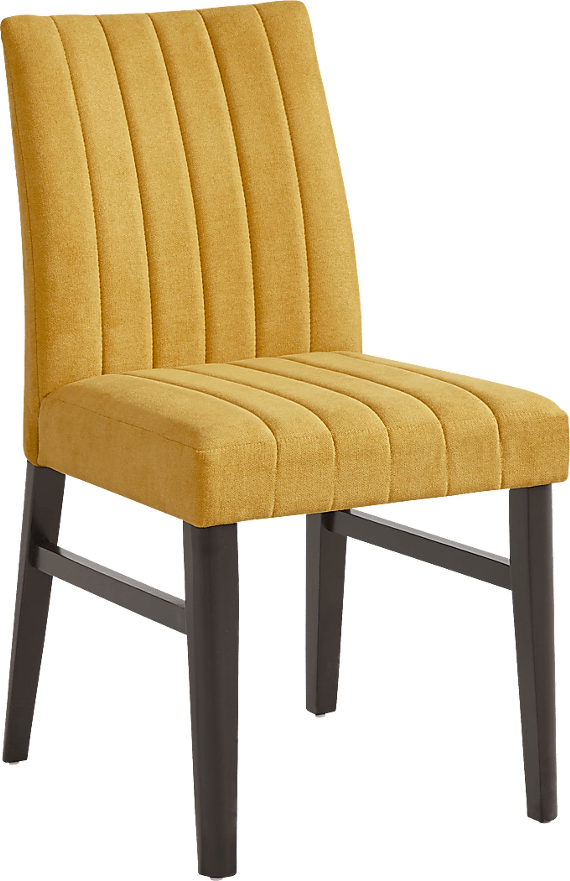 Round out your mealtime look with the Jarvis dining room. Contemporary in style, this upholstered side chair features vertical channeling that runs down the center of the gently sloping backs and spacious seating that emphasizes the fabric's gorgeous yellow color. Matching espresso finish on the legs offer the perfect final touch. 100% Polyester