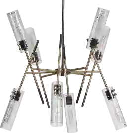 A dramatic soft contemporary look blends straight lines and linear glass to give us the eye-catching Jaxon Oaks chandelier. Featuring a combination finish of texture black and antique brass complementing the narrow clear cylinders of glass with unique swirled thread accents. Supplied with 15' wire, 3-12 stems and 1-6 stem for adjustable installation. Professional installation by an electrician is recommended.
