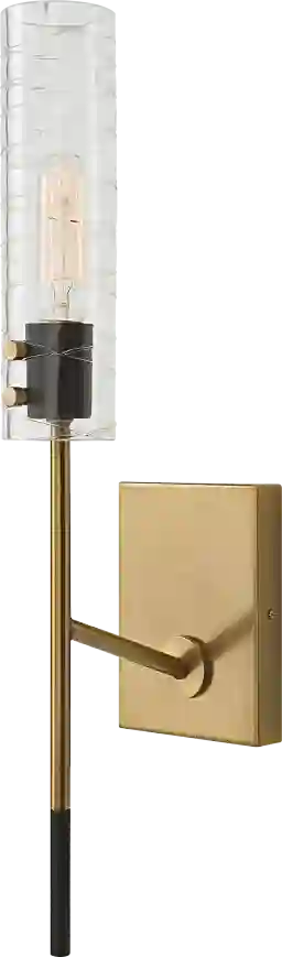 A dramatic soft contemporary look blends straight lines and linear glass to give us the eye-catching Jaxon Oaks sconce. Featuring a combination finish of texture black and antique brass complementing the narrow clear cylinders of glass with unique swirled thread accents. Professional installation by an electrician is recommended.