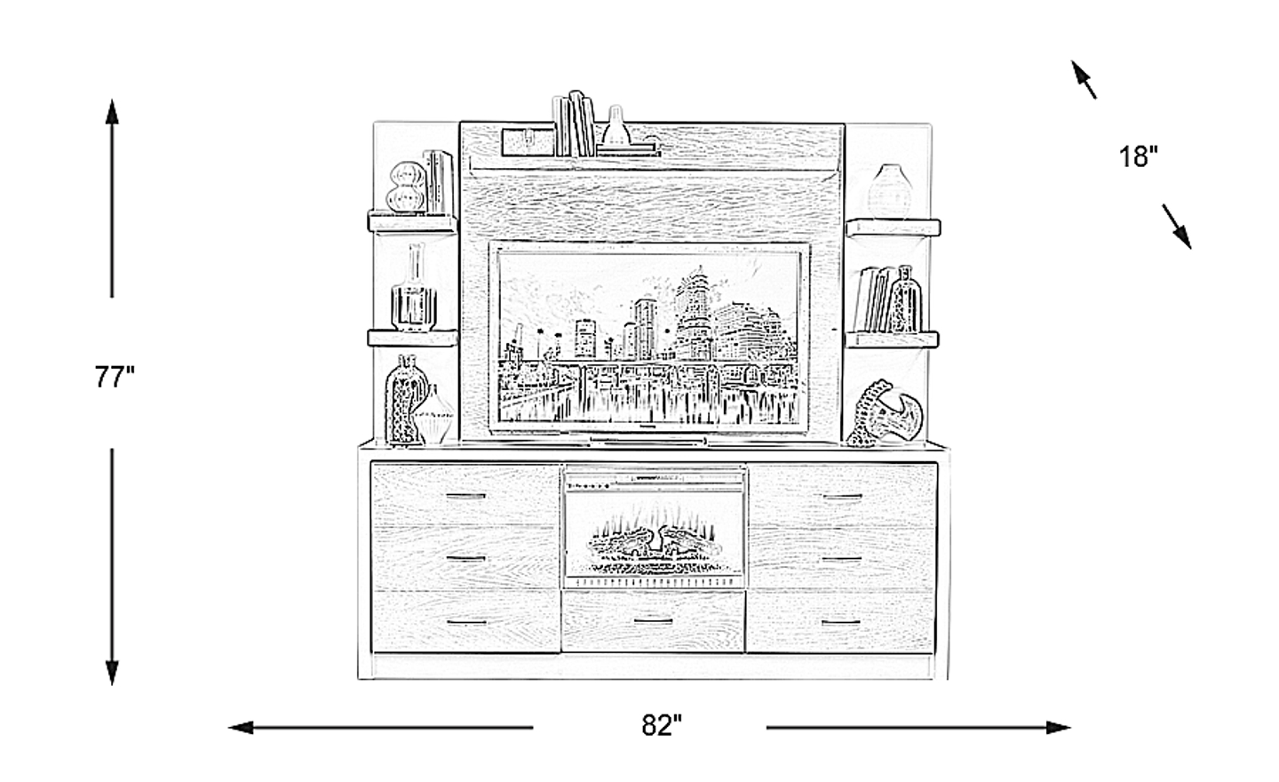 Contemporary style meets practical storage with the Jeana II wall unit. This piece is crafted of poplar solids with birch and oak veneers in an off-white finish. This home entertainment center features a back panel with floating shelves and a cut-out for cords while the 82-inch console offers plenty of room for a large flat screen TV. Cubbies for electronics and a roomy drawer are flanked by doors that are cleverly made to look like drawers. Each door opens to reveal an adjustable shelf. Pass through holes on the back panel keep wires tucked neatly out of view. Completing the setup is an electric LED crystal fireplace insert that boasts remote controlled heat and ambient lighting. It can heat up to 400 square feet of space, though the embers operate with or without heat.