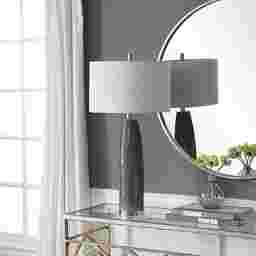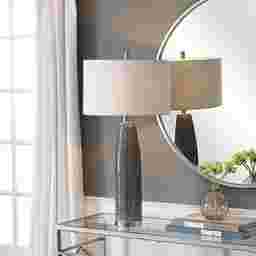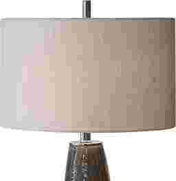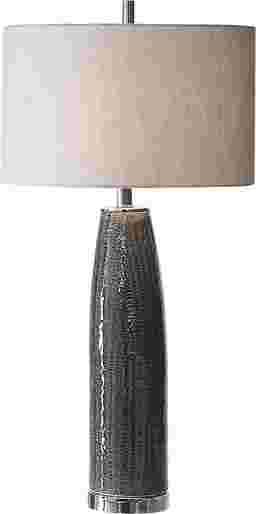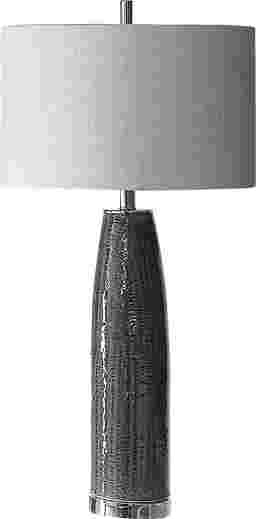 The Jellison table lamp features a textured, soft gray ceramic base with slightly tapered neck. Striation is enhanced by the highs and lows of the glaze. Accented with polished nickel plated details. The round cream linen shade coordinates with the cream highlights coming through the glaze. Due to the nature of fired glazes on ceramic lamps, finishes will vary slightly. Customer assembly is required.
