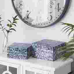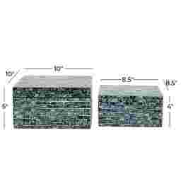 Bring the serene beauty of the sea into your home with Jemata, where soothing hues and natural textures create effortless charm. This elegant set of two decorative boxes is crafted from durable MDF and adorned with luxurious mother-of-pearl shell covers. The polished blue finish, accented with subtle green and white textures, adds depth and sophistication to any space. Inspired by coastal elegance, the inlaid mother-of-pearl and mussel shell edges create a striking, artisanal detail. Loved by design enthusiasts, Jemata turns everyday storage into a statement of refined style. Elevate your decor with Jemata and let your home reflect timeless beauty and thoughtful craftsmanship. Each blue mother of pearl shell box measures 9.65L x 9.7W x 5.3H, 8.45L x 8.45W x 4.15H inches, and collectively weighs 6.89 lbs. Customer assembly is required.