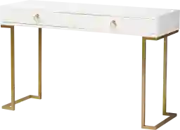 This table features a sturdy wood top and drawers supported by a solid metal base. The metal frame provides exceptional stability and weight distribution, preventing the wobbling often associated with all-wood designs. Additionally, the contemporary white finish over the wood creates a bright, airy aesthetic that is highly sought after in modern and coastal-inspired homes.