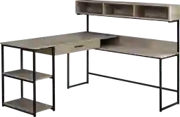 Let this Jessamin L-shaped corner desk / workstation inspire you with its practical and modern industrial aesthetic. It starts with a smooth laminate finish on all sides in a chic dark taupe wood-grain finish accented with strong black metal framing. The numerous storage options include a wide drawer on metal glides with a sturdy black plastic handle alongside an open cubby, and two fixed bottom shelves for books, magazines or even a small printer. The side station is so versatile that it can be assembled on the left or right hand side to suit your needs, with 3 spacious cubbies on top for all your work essentials. Customer assembly is required.