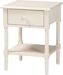 Enduring beauty is steeped within the intricate details of the stunning Jetexe ivory nightstand. This inspired farmhouse piece is crafted from sturdy wood. The drawer and open shelf offer space to organize bedside essentials, while reserving the tabletop for nightly use. The Jetexe features spindle legs for captivating visual allure rich with traditional charm. The round drawer knob accentuates the flowing design of the piece, making the Jetexe a blissful bedroom accessory. Customer assembly is required.