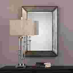 Unique and glamorous, the Jomaira mirror adds style and dimension to any interior space. This mirror features an antiqued silver metal finish surrounded by dark bronze details with a textured look. This mirror has a 1.25" bevel and can be hung either vertically or horizontally.