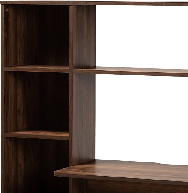 Adorn your home office or workspace with the handy design of the Jonlee desk. Constructed from sturdy wood displaying a warm walnut brown finish. The desk is outfitted with ten side storage compartments, as well as an overhead shelf to display decorations and store essential items. This desk features a spacious rectangular tabletop to maximize room for electronic devices and accessories. A helpful design that radiates contemporary charm, and modernizes any space. Customer assembly is required.