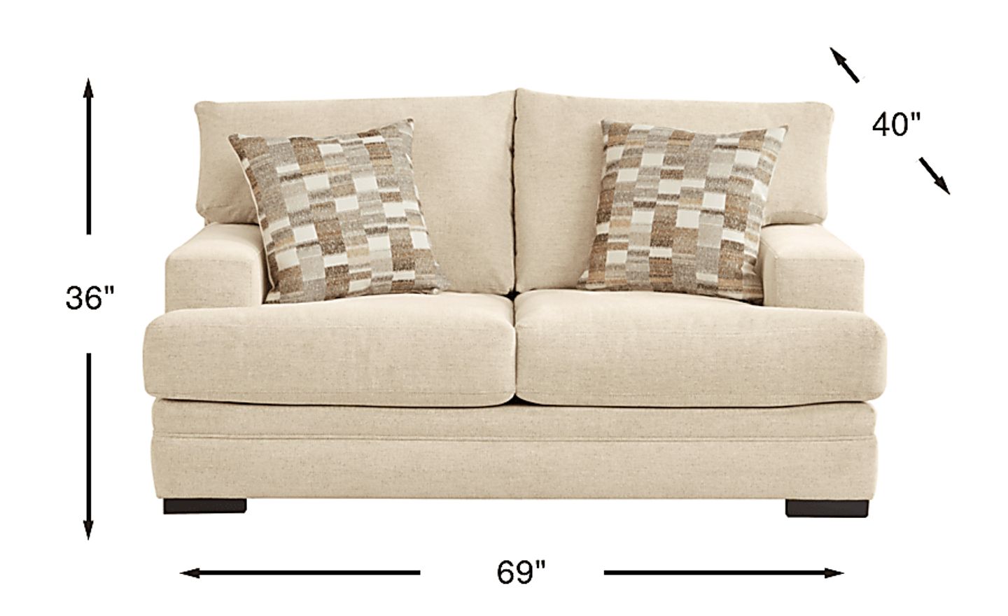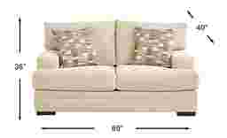 Greet each day with the warm, welcoming hug of the Jordan loveseat, its low, indulgent silhouette providing the siren call of cozy days and nights curled up with blankets and loved ones. Upholstered in beige woven twill fabric, this transitional piece features padded outside arms and backs, sophisticated track arms and reversible seat cushions for incredible comfort and easy cleaning. Jacquard pillows provide a splash of patterned color while channeled backs add a touch of charm. Contemporary styled block legs in a gorgeous black finish add the perfect final touch of contrast. Upholstery: 100% polyester.
