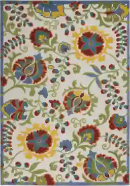 The contemporary floral pattern is designed for long-term wear. Polypropylene fibers are typically solution-dyed, meaning the color is integrated throughout the fiber rather than just on the surface. This provides excellent resistance to fading from UV exposure, allowing the ivory, blue, and red tones to remain vibrant even when placed in direct sunlight on an open deck or balcony.