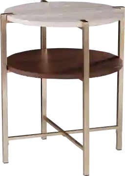 Double up on storage and style with this two-tier Journeyville end table. Supported by a brass-finished metal frame and crafted with mixed-material design, this round accent table adds a unique look to your space. A reading lamp and cup of tea find their home on the faux marble tabletop, while the lower shelf displays magazines and books. Place this small side table next to your favorite armchair for classy display storage within reach, or add to your open concept living space for a versatile accent to round out your interior design. Customer assembly is required.