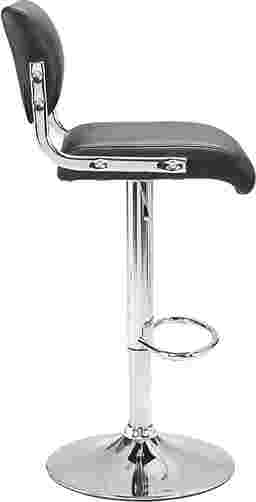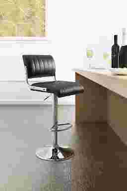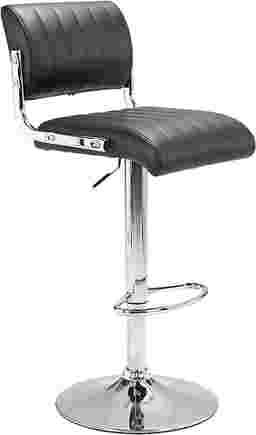 The Juice Bar black adjustable swivel barstool features a modern armless profile and chrome accents for a bold look. The plush seat and back design offer slim tufted panels for added comfort and all day enjoyment. Supported by chrome column and round base. Some assembly required.