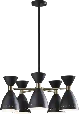 Add some mid-century modern flare to your entry-way or over a dining table with the Jules Drive pendant-chandelier. With five adjustable over-sized shades, this lamp provides ample overhead lighting while transforming the ambiance of the room at the same time. Black and antique brass finishes are mixed to create the quintessential mid-century style. Installation by a professional electrician recommended.