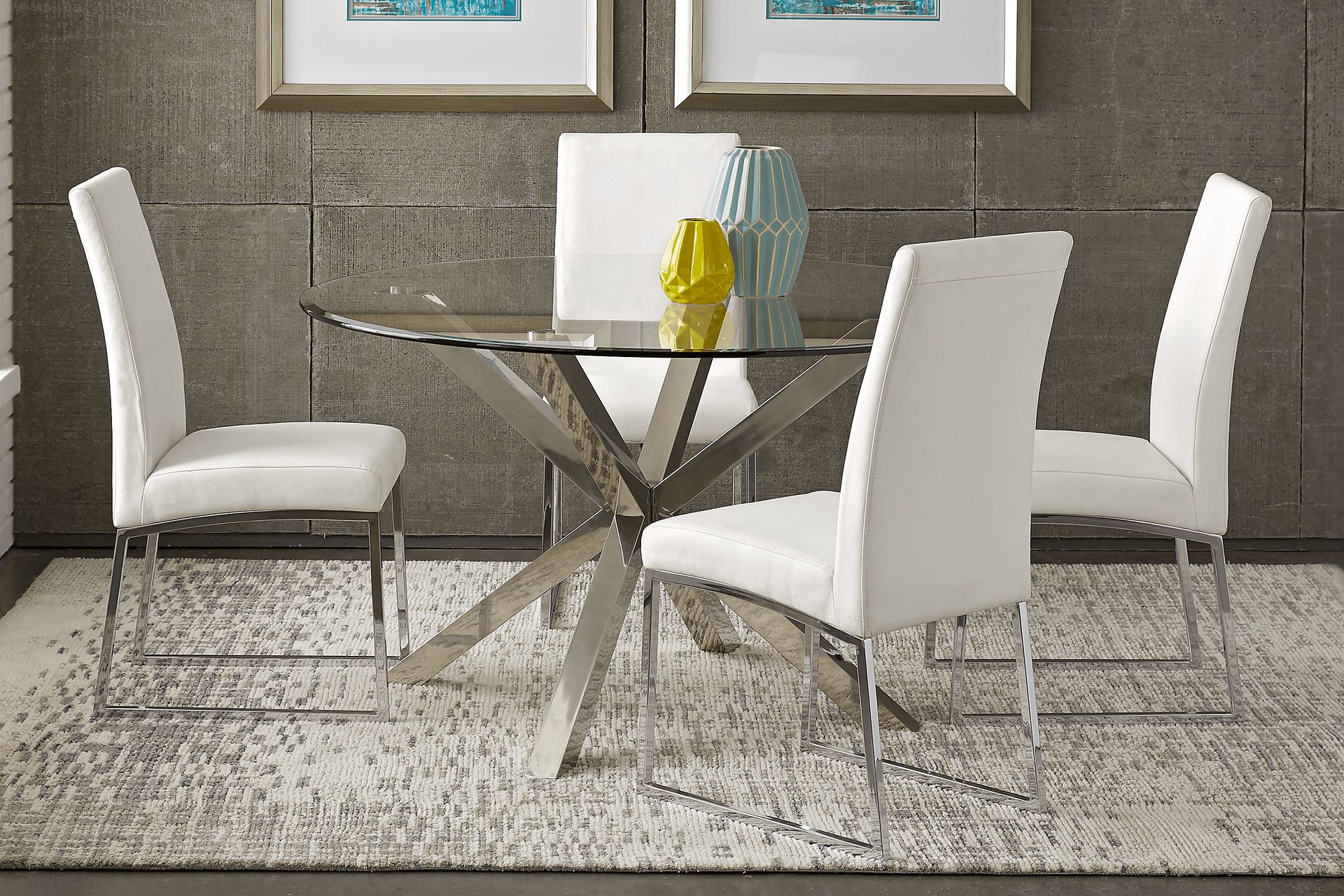 Sleek contemporary dining at its finest. The Jules dining set features a stunning round glass top table with a striking chrome base. Coordinating side chairs upholstered in easy-to-clean off-white UltraHyde fabric feature matching chromes finished legs for a cohesive modern look.