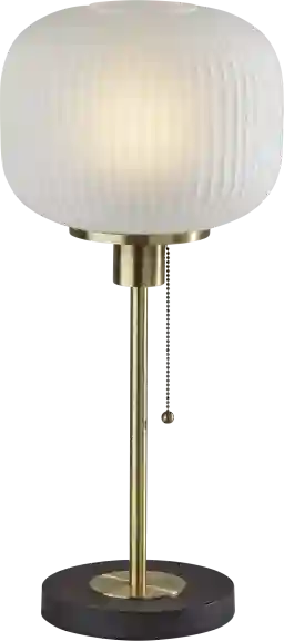 Add a classy touch of mid-century design to your space with the Julia Lane brass lamp. A frosted ribbed glass shade emits a beautiful ambient glow when lit. Antique brass accents and a black fabric cord add to the clean, modern design. Sure to please the most discerning of style! May require partial assembly.