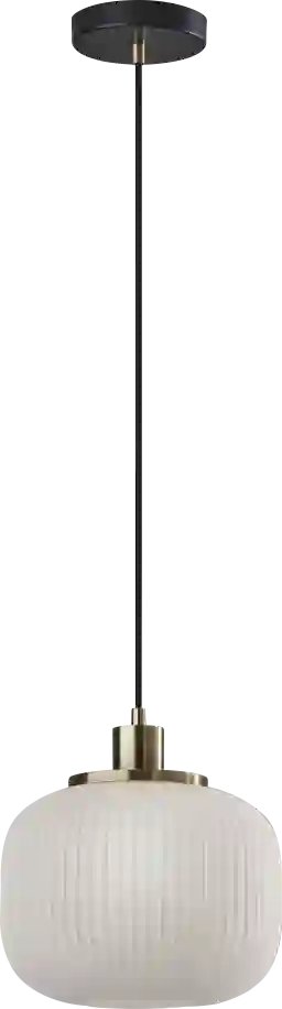 Add a classy touch of mid-century design to your space with the Julia Lane brass pendant. A frosted ribbed glass shade emits a beautiful ambient glow when lit. Stagger multiple over a dining space for a statement making ceiling display or hang in a row over a kitchen counter to liven up the cooking area. Antique brass accents and a black fabric cord add to the clean, modern design. Installation by a professional electrician recommended.