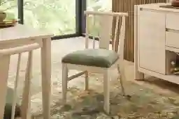 From serene quiet mornings to calm yet lively gatherings, the Julian collection embodies a dining space grounded in balance, beauty and effortless versatility. Contemporary in style, this side chair comes in a light natural finish and features elegant spindle legs and back. The upholstered seat in rich olive-green adds a complementing contrast.