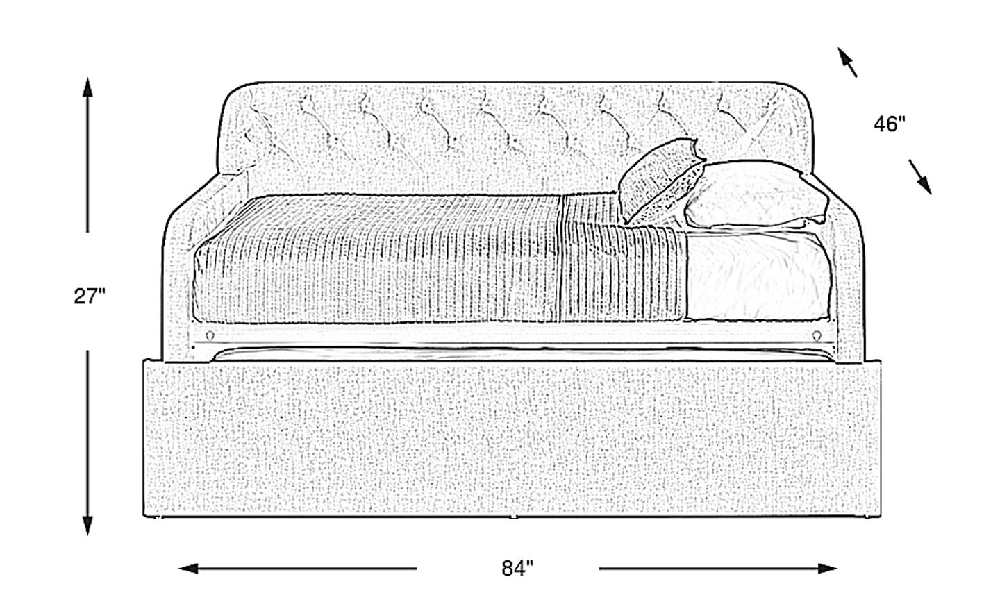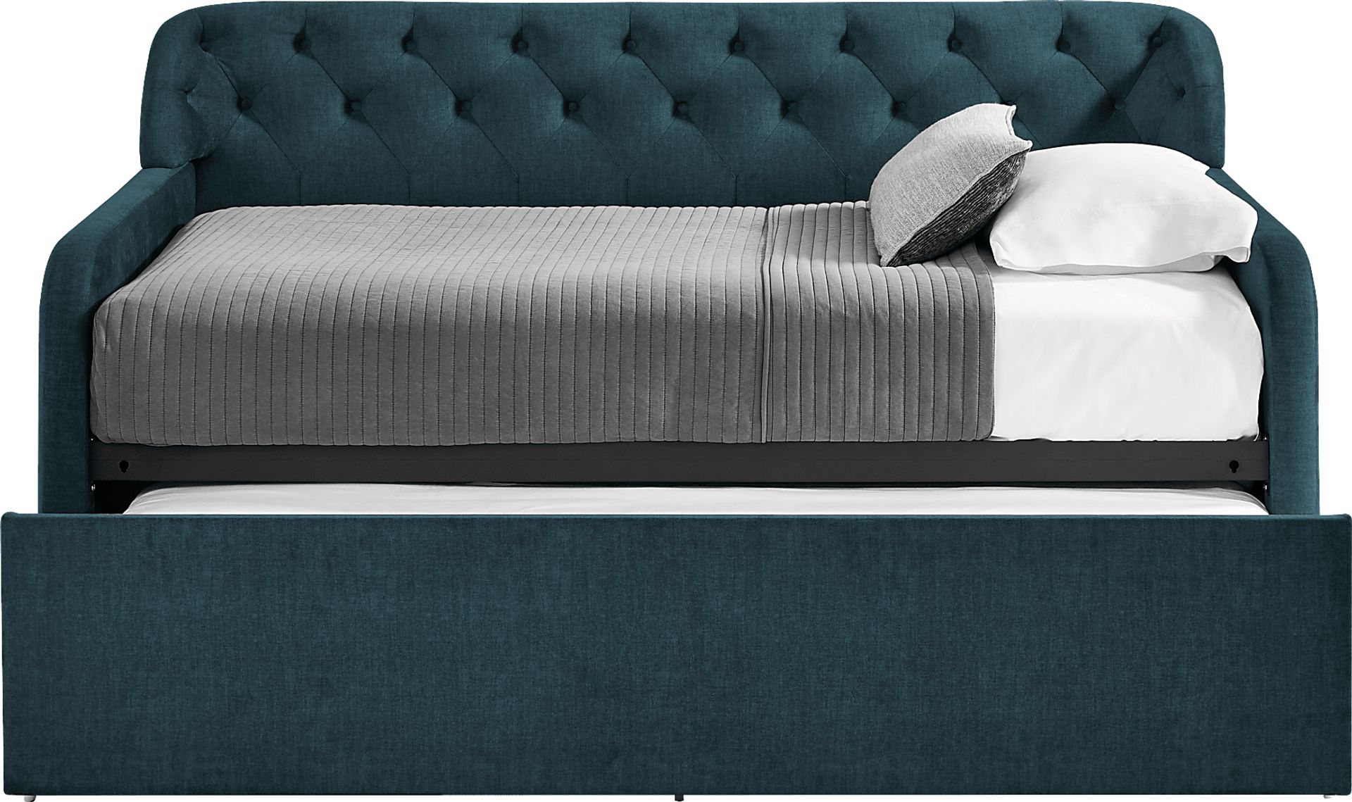 The sophistication of a boutique retreat comes home with the Juliet daybed's tailored details, gentle curves and straight lines creating a space that's as stylish as it is restful. The soft deep ocean blue upholstery is accentuated by gorgeous deep tufting along the backboard, introducing a classic yet contemporary flair. Waterfall edges curate a graceful silhouette evoking effortless elegance. Store slim books, magazines, or remotes in the side pockets that blend seamlessly into the outer arm panel. The included trundle offers extra storage space perfect for seasonal clothes, bedding, or even a twin mattress. Mattress and foundation (if required) sold separately. Upholstery: 100% polyester.
