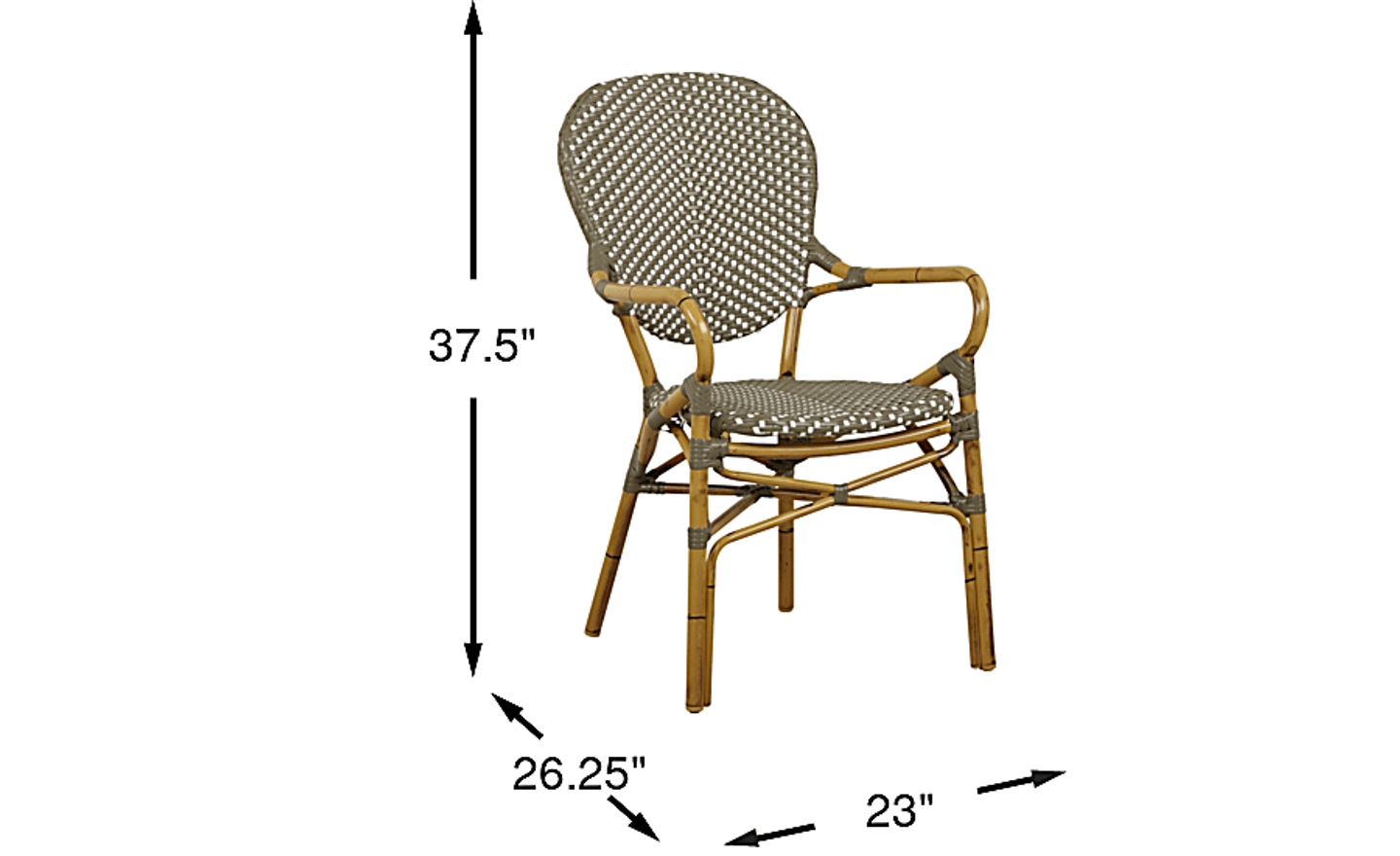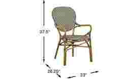 Enjoy outdoor meals with Parisian flair when you have the Juliette arm chair. This casual chic seating, inspired by French cafes, features a high back and gracefully curved arms. The chair is made with durable aluminum and gray vinyl wicker. The frame and legs are hand-painted in a natural finish to look like real rattan.