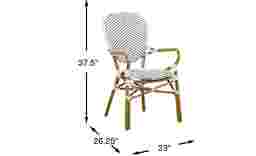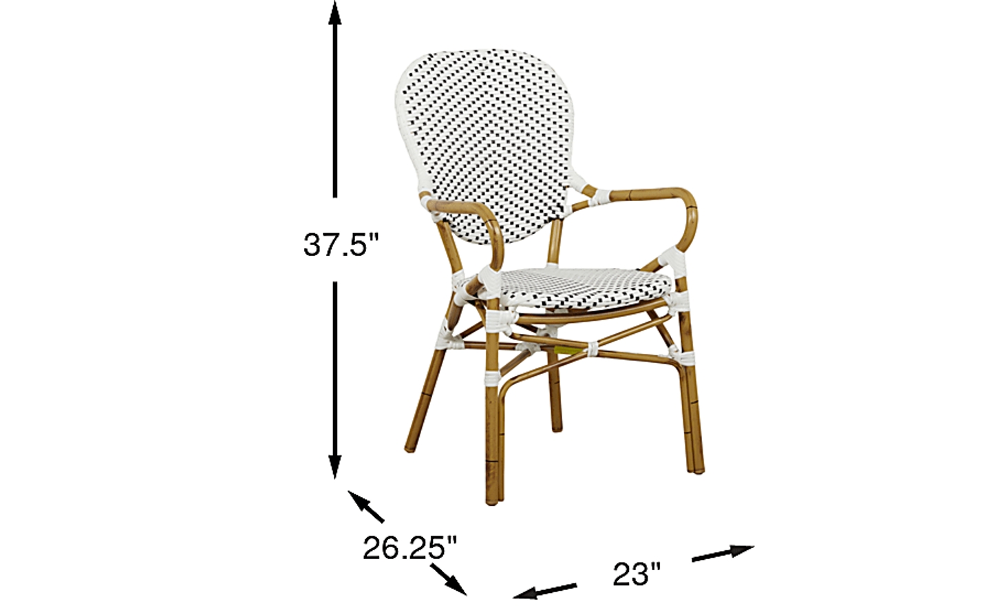 Enjoy outdoor meals with Parisian flair when you have the Juliette arm chair. This casual chic seating, inspired by French cafes, features a high back and gracefully curved arms. The chair is made with durable aluminum and gray vinyl wicker. The frame and legs are hand-painted in a natural finish to look like real rattan.