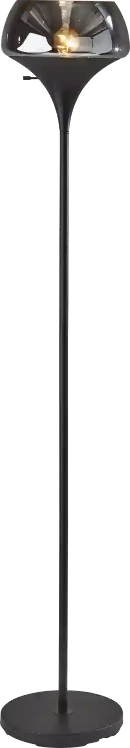 A torchiere is specifically designed to provide indirect ambient lighting by directing illumination upward toward the ceiling. This creates a soft, room-filling glow that reduces harsh shadows, making it an ideal primary light source for rooms that lack built-in overhead fixtures. This particular lamp features a smoked mercury glass shade that further diffuses the light for a sophisticated, atmospheric ambiance.