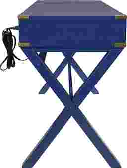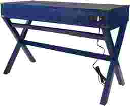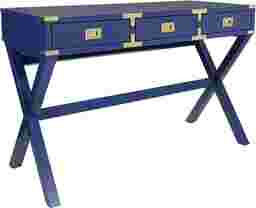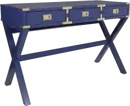 This desk features a bold blue wood-look finish that serves as a vibrant focal point in contemporary or transitional decors. The design is elevated by sophisticated gold hardware and bar pulls, paired with distinctive X-frame legs. These elements combine to create a piece that functions as both a workspace and a stylish accent table.