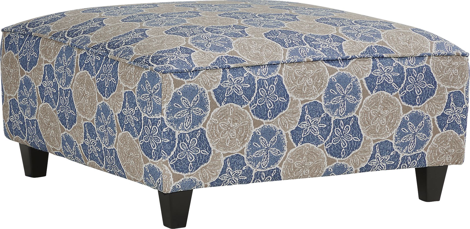 Like a serene vision of beautiful sky meeting peaceful sea, the Kailani Coast cocktail ottoman balances delicate style with sumptuous relaxation. Upholstered with woven fabric that features a blue tone sand dollar pattern, this ottoman offers an extra seat, footrest and more. Neatly tapered legs provide a stylish final compliment for this look. Upholstery: 100% Polyester.