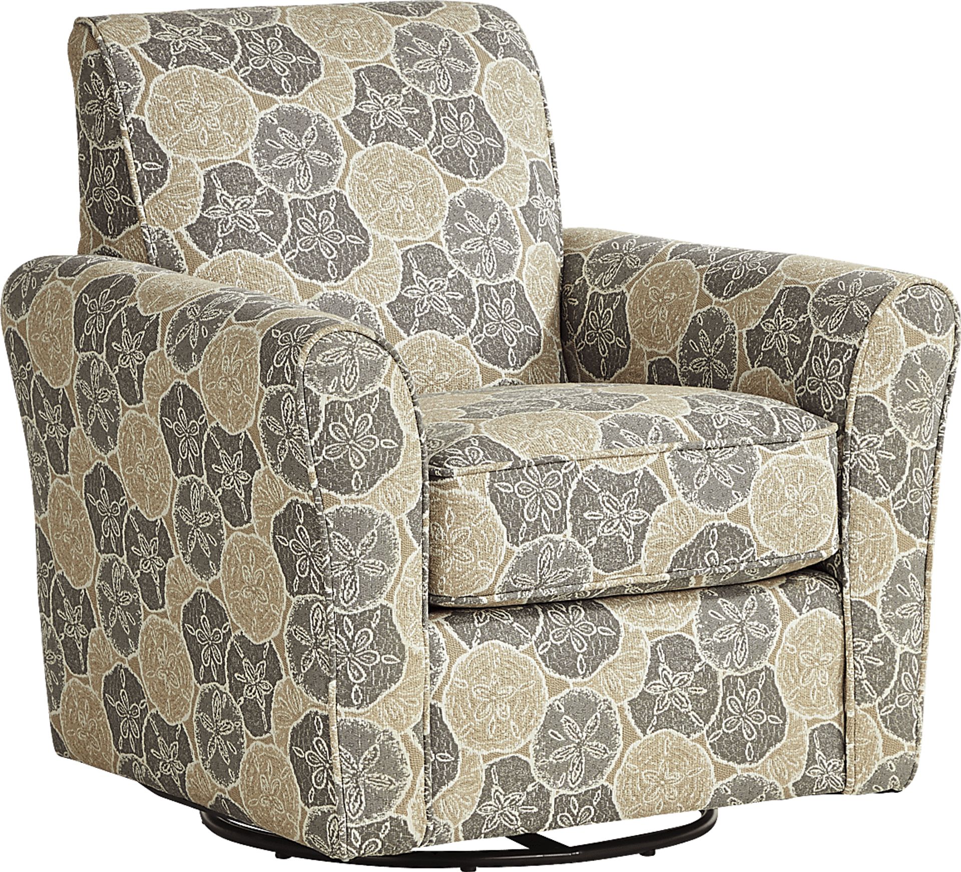 Like a serene vision of beautiful sky meeting peaceful sea, the Kailani Coast swivel chair balances delicate style with sumptuous relaxation. Upholstered with woven fabric that features a gorgeous sand dollar pattern, this swivel chair has elegant track arms coupled with a wingback for stunning effect. The base allows you to leisurely pivot back and forth with ease. Upholstery: 100% polyester.