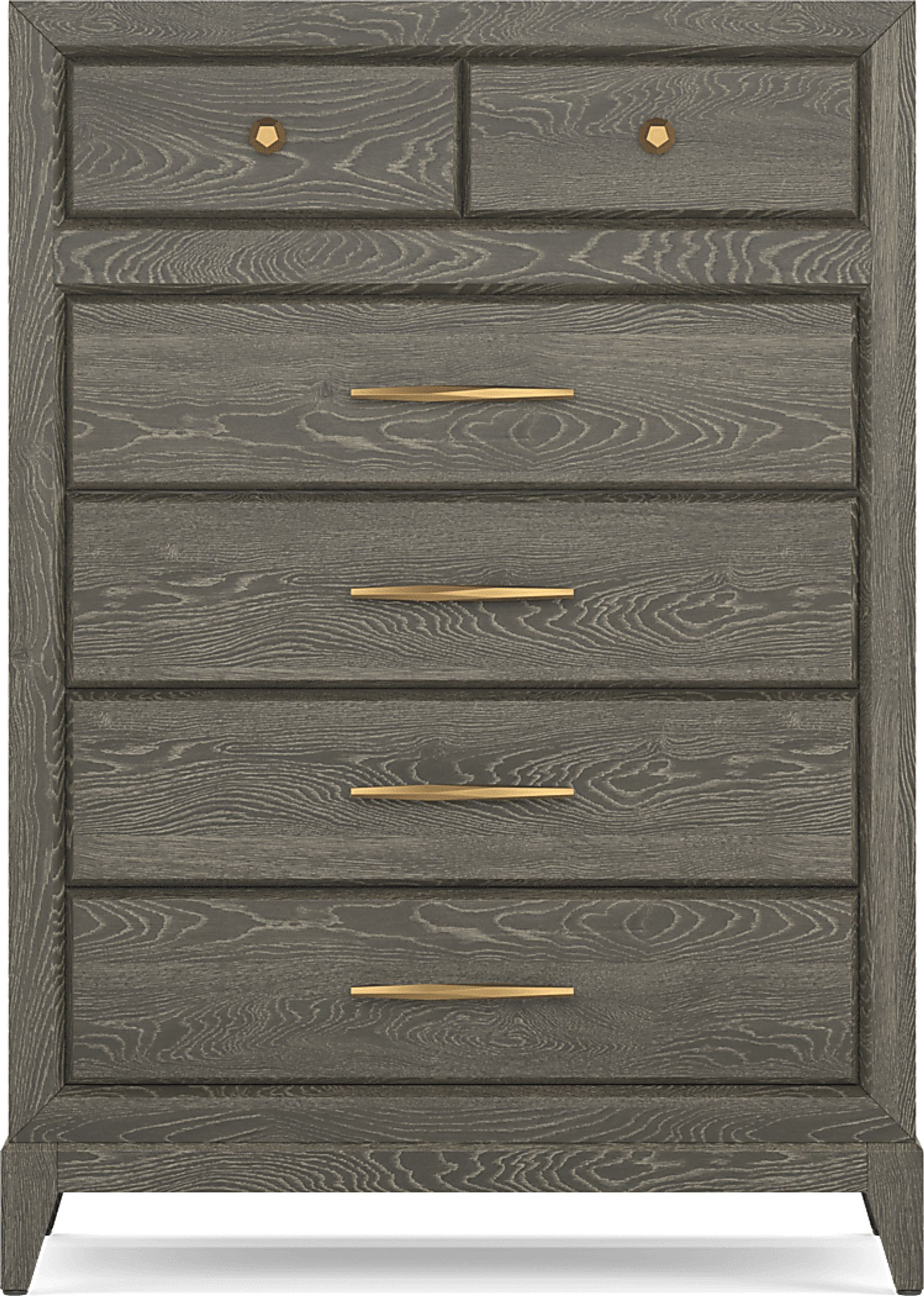 Upgrade your bedroom's storage setup with the stunning Kailey Park chest from Cindy Crawford Home. Contemporary in style, this piece has oak veneer surfaces in a charcoal finish that brings a sleek touch to your space. Its five drawers feature beautiful gold hardware and boast ample room for keeping clothing and other essentials organized.