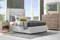 Kailey Park Light Oak Finish 7 Pc Bedroom With Harlow Hill Taupe Queen Upholstered Storage Bed
