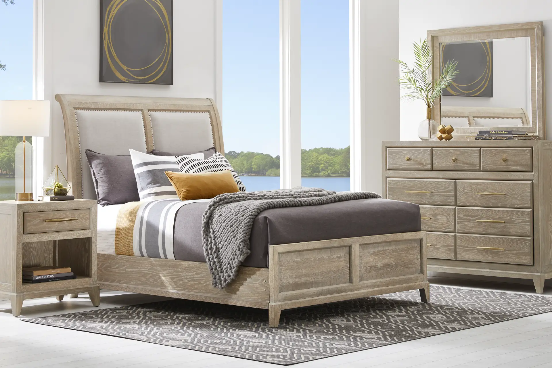 You'll love coming home to the beautiful Kailey Park queen bedroom from Cindy Crawford Home. The bed showcases oak veneers in a light oak finish that can brighten up your space. Featuring an upholstered sleigh headboard, this design makes it easy to relax and unwind in contemporary style. Adding to the appeal, the matching pieces feature beautiful gold hardware. Mattress and foundation (if required) sold separately.