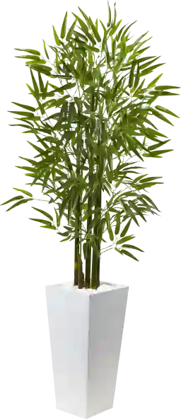 The UV resistant leaves of this 5' Kaio bamboo silk tree make it perfect for indoor and outdoor use. Their slender shape and green color blend in well with the green bamboo poles. Its sturdy poles are rooted in white river rocks.