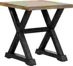 Presenting an ideal surface for a lamp or decorative item, the Kalani end table complements any type of decor. Crafted from poplar solids and oak veneers in a two-tone washed wood light brown and black finish, the X-shaped legs add a dynamic look to this transitional piece.
