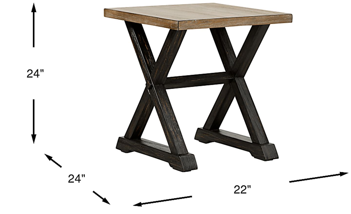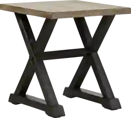 Presenting an ideal surface for a lamp or decorative item, the Kalani II end table complements any type of decor. Crafted with oak veneers in a two-tone washed wood light brown and black finish, the X-shaped legs add a dynamic look to this transitional piece. Customer assembly required.