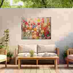 A captivating swath of colorful blooms brings the Kaleidoscope Flower outdoor wall art to life, each bold stroke of red, yellow and orange playing against a muted background of beige, blue and gray. This artist canvas accent is rendered with a tempera effect, coated with UV- and waterproof lacquer to prevent fading and gallery wrapped on all-weather poly-vinyl stretcher bars. Designed to withstand 60 mile per hour winds, this print includes simple and effective hardware for outdoor installation. This outdoor canvas art can be placed in any outdoor location with direct exposure to the elements.