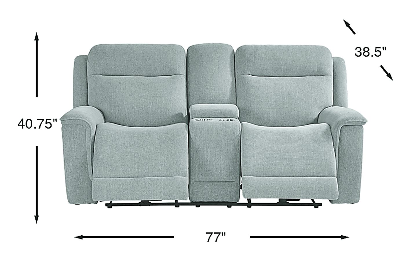 Radiating warmth and charm, the Kamden Place loveseat offers a bright and friendly spot where family life can blossom. This transitional piece features soft, padded curves upholstered in a seafoam colored woven fabric. Scoop seats and pillow arms provide inviting comfort and support to sink into, and the plush seat backs enable blissful sessions of extended relaxation. Dual power reclining includes independently adjustable headrests and footrests as well as USB charging ports on each control panel. This loveseat also features a center console with storage and cupholders for even more convenient leisure. Upholstery: 100% Polyester.