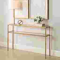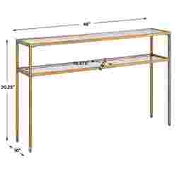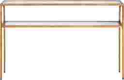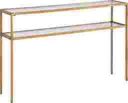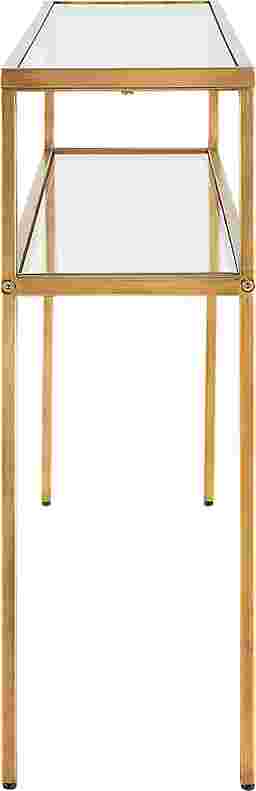 The simple profile of this Kande iron console table will complement a variety of decor styles. Finished in a warm gold, each shelf is adorned with tempered glass and perfect for displaying decorative accents. The second shelf is approximately 7.5" below the bottom of the top shelf. The depth of the table allows ample space for displays but appropriate for entryway, hallway or living room. Customer assembly required.
