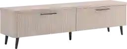 Introducing the Kassy beige console, a stunning new addition to the realm of Mid-Century modern design. Crafted from premium manufactured wood, each piece showcases exquisite wood ribbed doors and drawers, adding a textured sophistication to your living space. The sleek black metal handles complement the splayed metal legs, creating a harmonious blend of elegance and contemporary flair. The Kassy redefines style and function and seamlessly enhances your homes decor with a touch of modern nostalgia. Customer assembly is required.