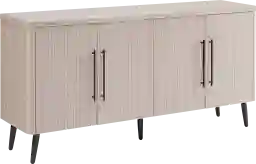 Introducing the Kassy beige sideboard, a stunning new addition to the realm of Mid-Century modern design. Crafted from premium manufactured wood, each piece showcases exquisite wood ribbed doors, adding a textured sophistication to your living space. The sleek black metal handles complement the splayed metal legs, creating a harmonious blend of elegance and contemporary flair. The Kassy redefines style and function and seamlessly enhances your homes decor with a touch of modern nostalgia. Customer assembly is required.