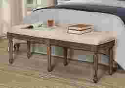 Perfect for the end of your bed, an entryway, or anywhere extra seating is needed, this classic bench features hand carved details, fluted legs and a warm medium brown wash finish. A natural beige fabric covers the raised padded seat. Some assembly required.