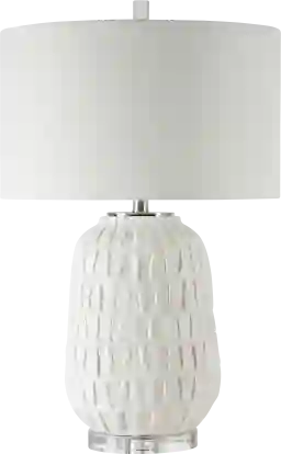 A modern take on old world style, the Katherina Alley lamp features a textured, aged white ceramic base with an organic grid design displayed on a thick crystal foot with polished nickel accents. The lamp is paired with a white linen drum shade. Add this lamp to your living room or bedroom for a classical touch. Partial assembly may be required.