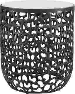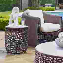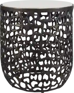 This striking Kayafa side table boasts a white marble top with subtle gray veining, creating a luxurious contrast with the golden dark bronze finish of its intricately patterned cast aluminum base. Due to the nature of natural stone, every piece will vary slightly ensuring yours is unique. Suitable for both indoor and outdoor use. Customer assembly required.