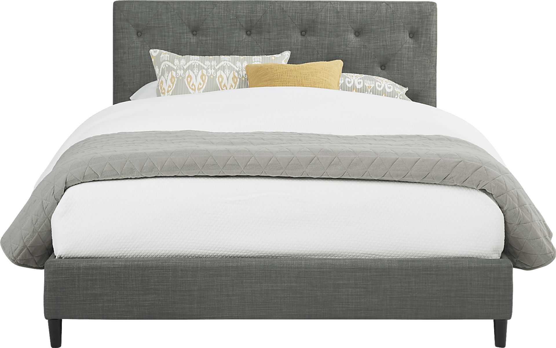 Luxury and value combine on the chic Kaylan bed. This contemporary bed is upholstered in linen-style fabric in a neutral gray color. Tufted details on the headboard add interest while the low footboard and straight lines emphasize the clean aesthetic. The bed comes with slat rolls, so no box spring is needed. Mattress and foundation (if required) sold separately.