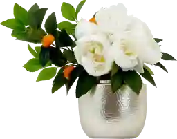 Inspired by nature, the Kaynyne white floral arrangement with vase features dahlias nestled between large peony blooms for added interest and visual appeal. Crafted from high-quality materials, the verdant leaves bring vibrant colors to any space. Designers love it in a bathroom, entry way or coffee table.