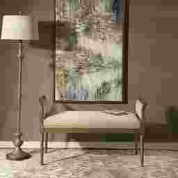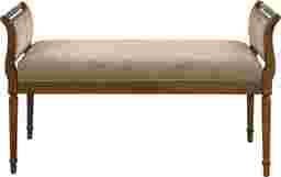 With a graceful transitional style, the Kaywood accent bench, features a solid curved birch wood frame accented with turned legs and dowel arms, finished in a warm pecan and covered in a plush malted milk chenille. Seat height is 21". Customer assembly is required.