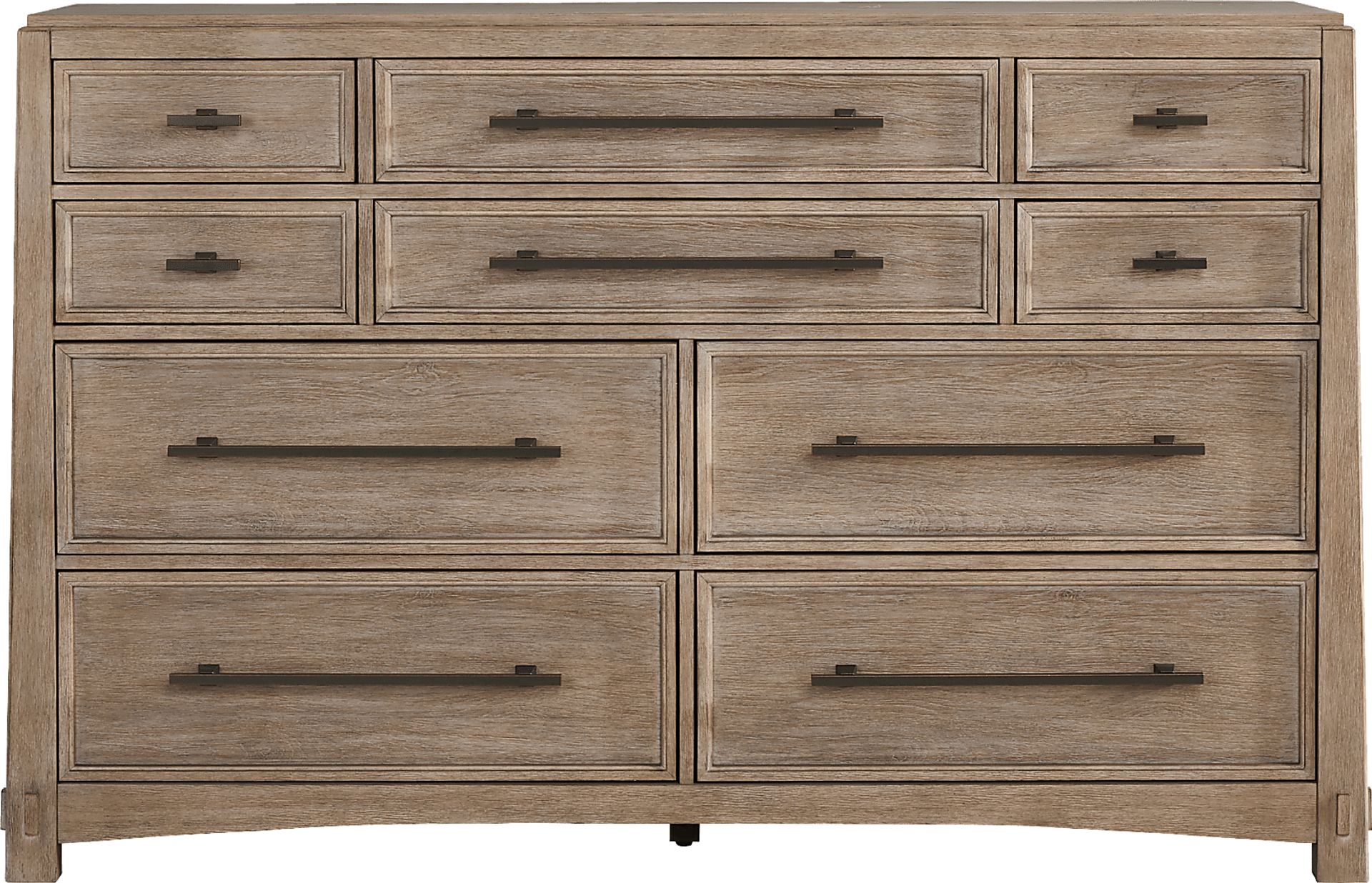 A soothing, relaxing feeling flows throughout the Keaton dresser, carried by strong lines and meticulous, eye-catching details. Rendered in pine veneers and finished in earthy taupe, this transitional piece is rich with mission-style accents. The tapered top and flared base create an unmistakable silhouette. At the base of this piece, pronounced joinery adds another touch of authentic craftsman flair. Black metal bar pull hardware adds contrast to each of the dresser's ten drawers. On the back, a set of mounting brackets mean that a matching mirror (not included) can be installed for a functional final touch.