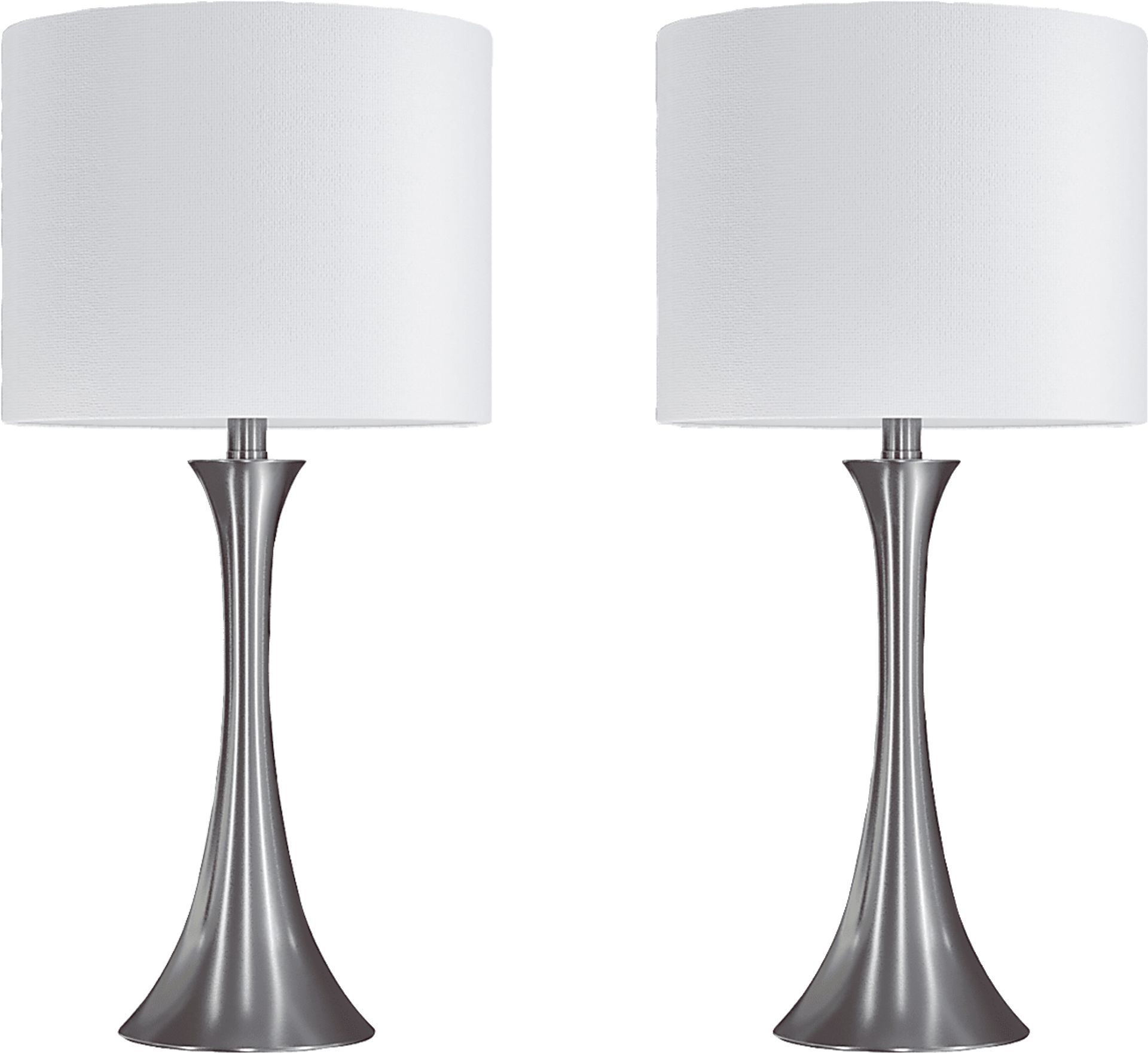 The Keely Alley lamp, set of 2 showcases an eye-catching hourglass figure with a dramatic flaring bottom half, all in a beautiful brushed platinum finish. Topped by drum shades wrapped in elegant white, semi-gloss linen fabric, this table lamp set will add a dash of modern style to any room. Whether resting on your nightstands, set on a side table in the den, or tucked into your favorite reading nook, this lamp set is a chic addition to any aesthetic. Partial assembly may be required.